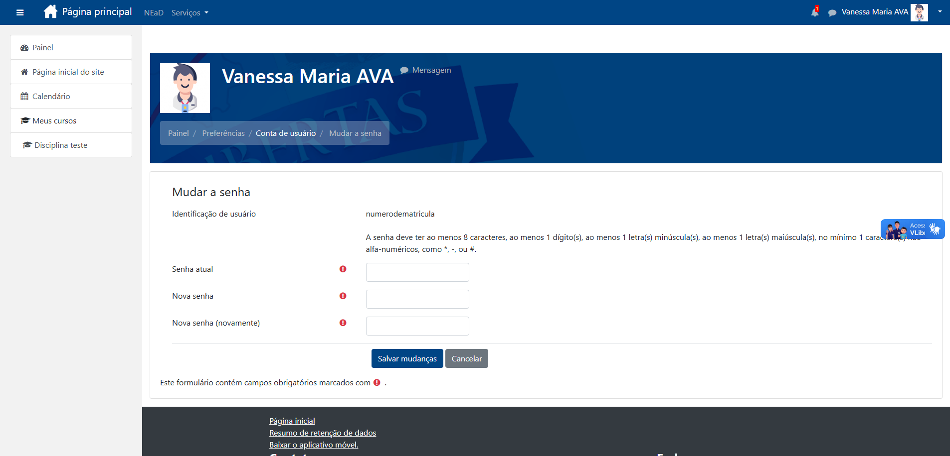 Se você já está logado no AVA e deseja alterar sua senha, siga o passo a passo abaixo: